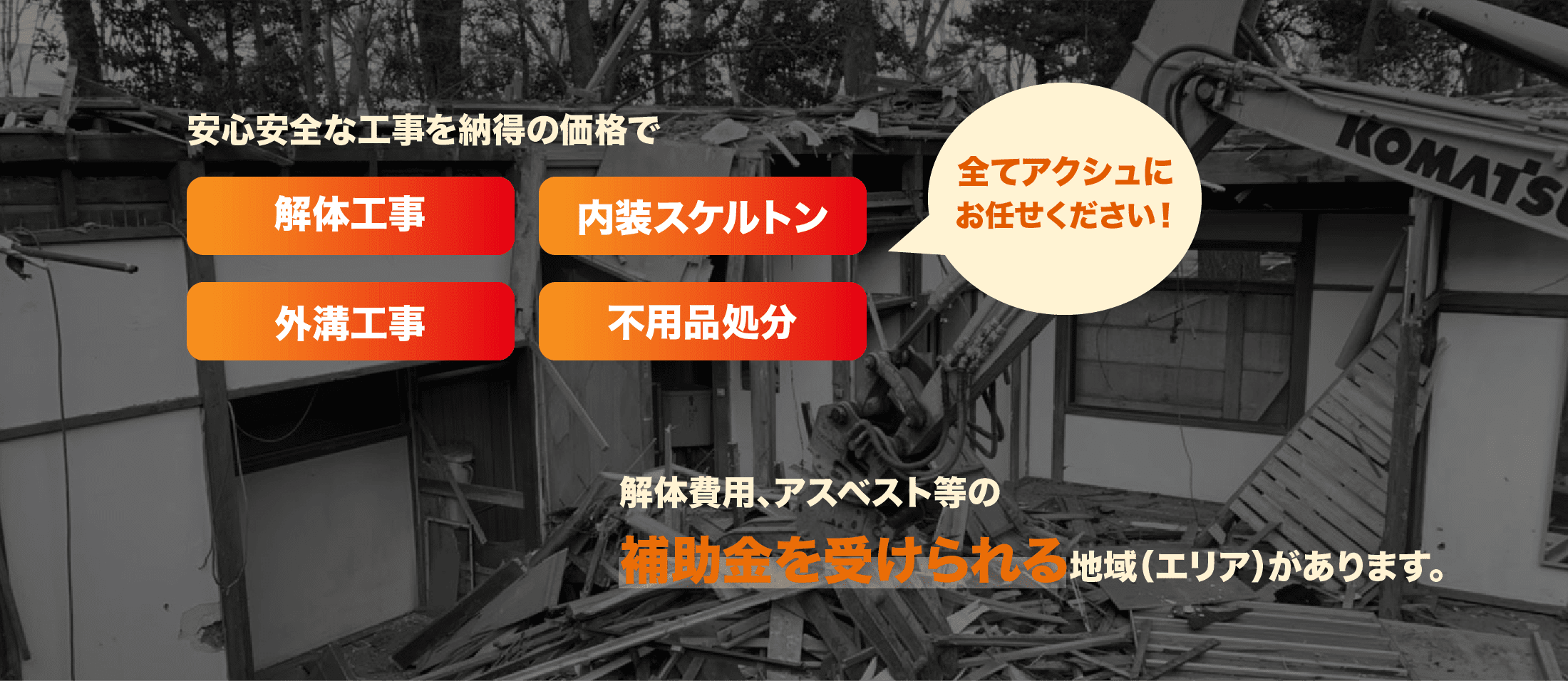 解体物件にアスベストが使用されているかどうかも、合わせて確認をさせていただきます。使用されている場合には、行政により補助金の申請ができる場合もあります。申請は建物所有者が行いますが、申請方法や書類の手配のお手伝いを私どもがさせていただきます。